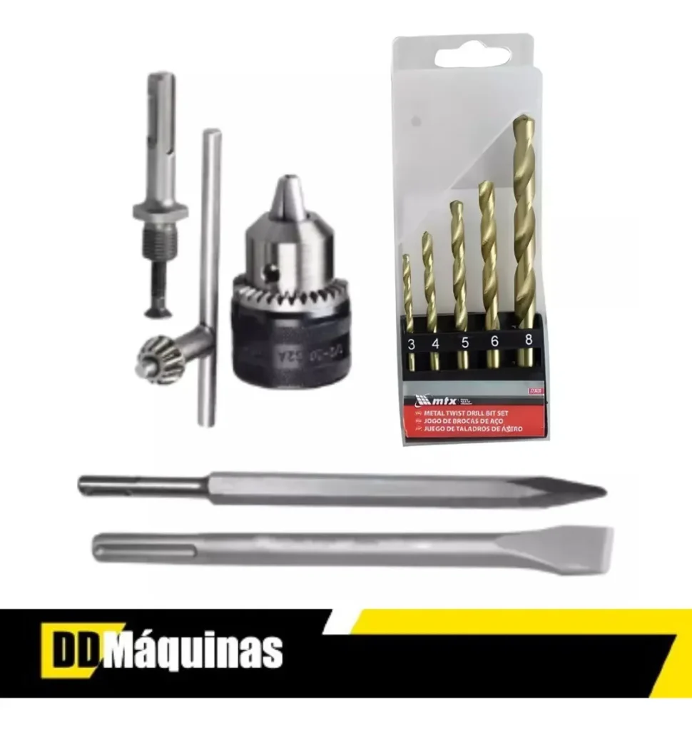 Depende do vendedor. A versão básica inclui empunhadura lateral, limitador de profundidade e maleta . Alguns vendedores oferecem kits completos com 5 brocas, 1 ponteiro e 1 talhadeira (como mencionado na descrição). Verifique a descrição específica do anúncio antes da compra para confirmar os itens inclusos .