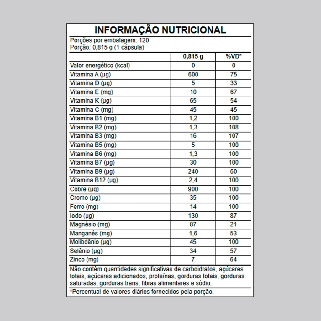 Gestantes e lactantes devem consultar médico antes de usar qualquer suplemento. Existem multivitamínicos específicos para gestação com dosagens ajustadas de ácido fólico, ferro e outras vitaminas essenciais neste período. Não use sem orientação profissional.
